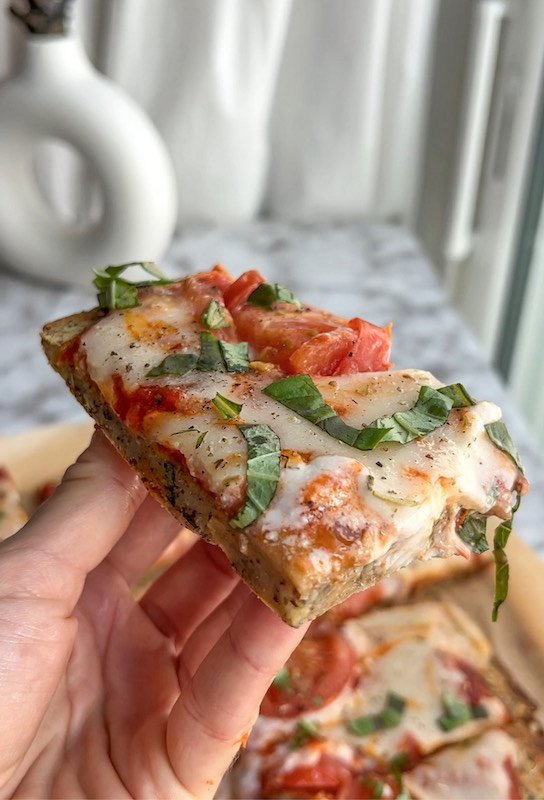 i kept it classic with vegan cheese, tomato sauce, and fresh tomatoes, which pair beautifully with the subtly sweet crust. here are a few other topping ideas: