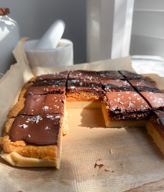 simply press the shortbread dough into a pie dish or silicone muffin cups, then layer with the almond butter caramel and chocolate topping as directed.