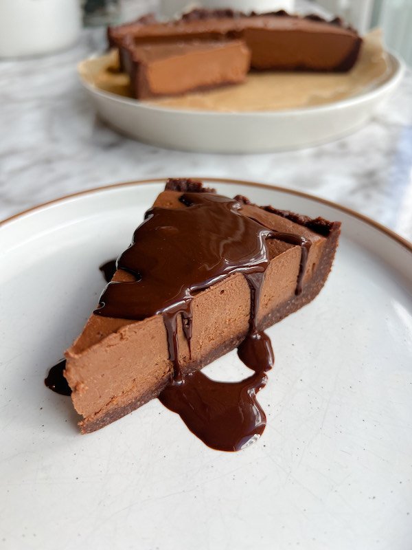 the crust is chewy and chocolaty, with a subtle nuttiness from almond flour.