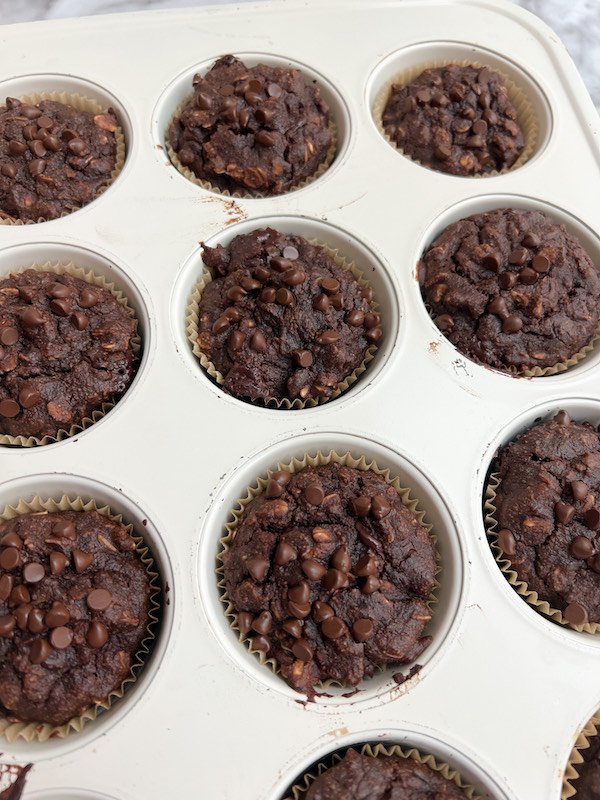 these muffins are soft, slightly chewy from the oats, and have the perfect balance of sweetness and chocolatey goodness.