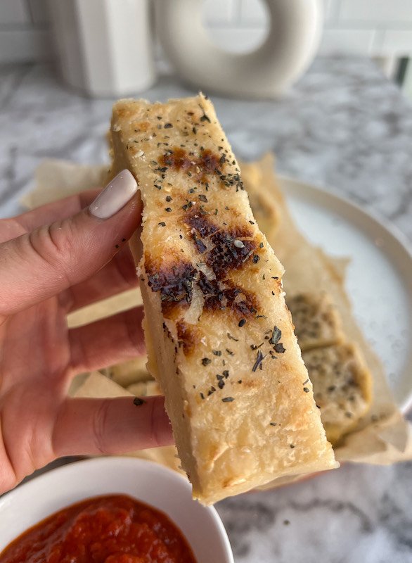 the vegan mozzarella on top adds a perfect cheesy finish that pairs perfectly with the breadsticks’ dense texture.