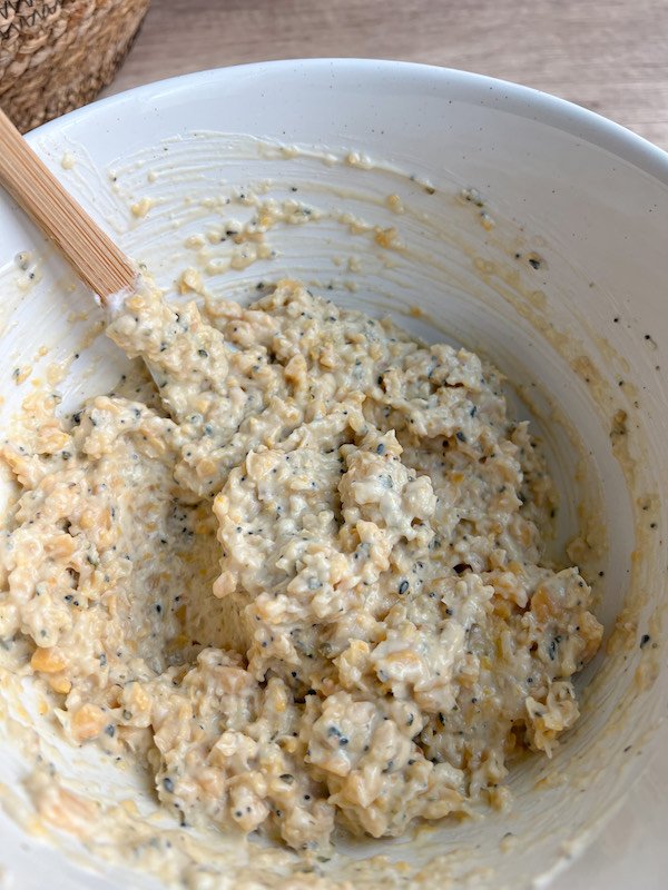 -add vegan mayo, thick coconut yogurt, garlic powder, everything but the bagel seasoning, hemp seeds, and dijon mustard to the bowl with the chickpeas. - mix and stuff: