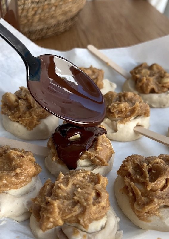 - once the yogurt pops are frozen, spread the peanut butter mixture on top of each pop.