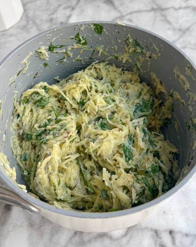 how to make plant-based spanakopita baked spaghetti squash
