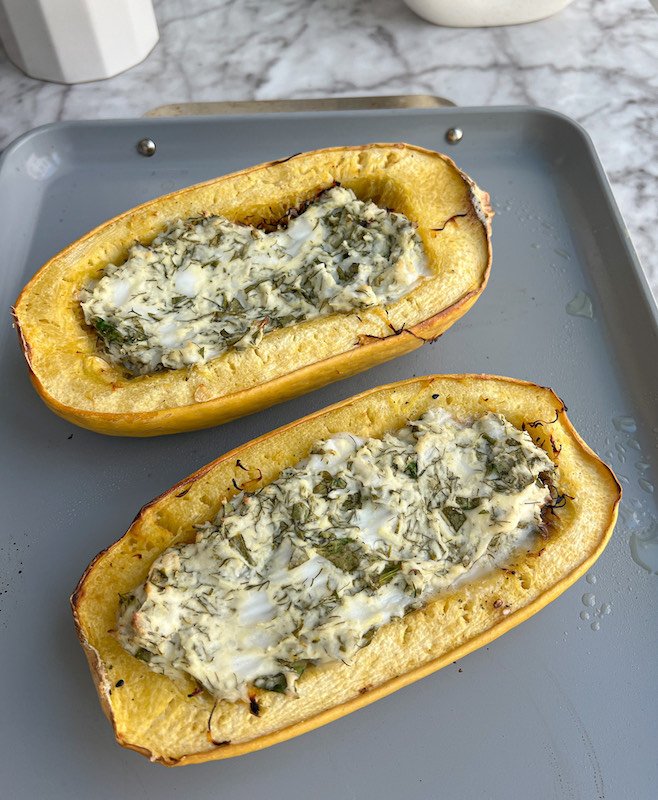 - once the squash is done baking, remove it from the oven and divide the spanakopita mix evenly between the two squash halves, placing it in the center of each half.