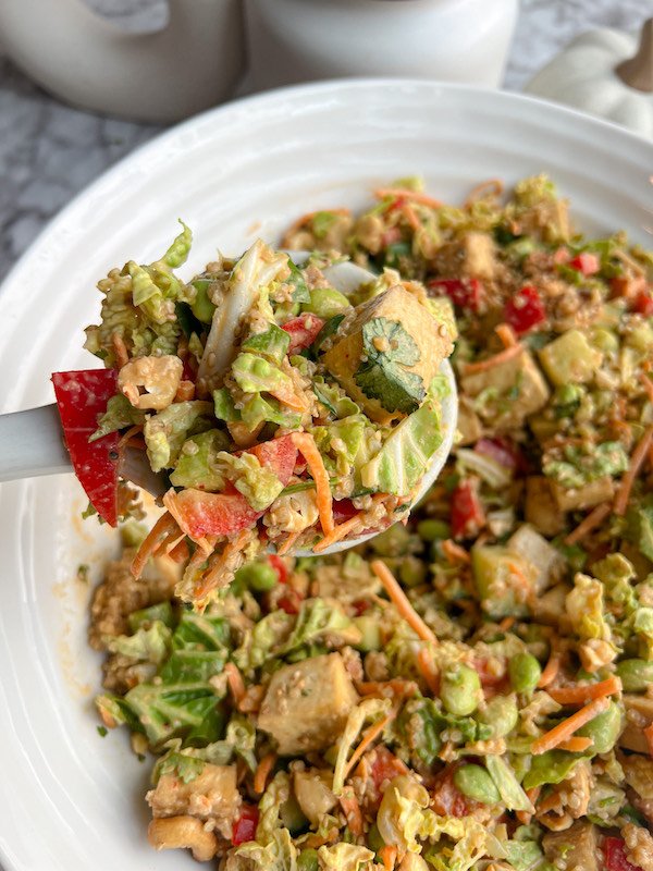 the combination of fresh veggies, quinoa, crispy tofu, and roasted cashews gives this salad a perfect balance of crunch and creaminess.