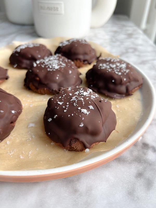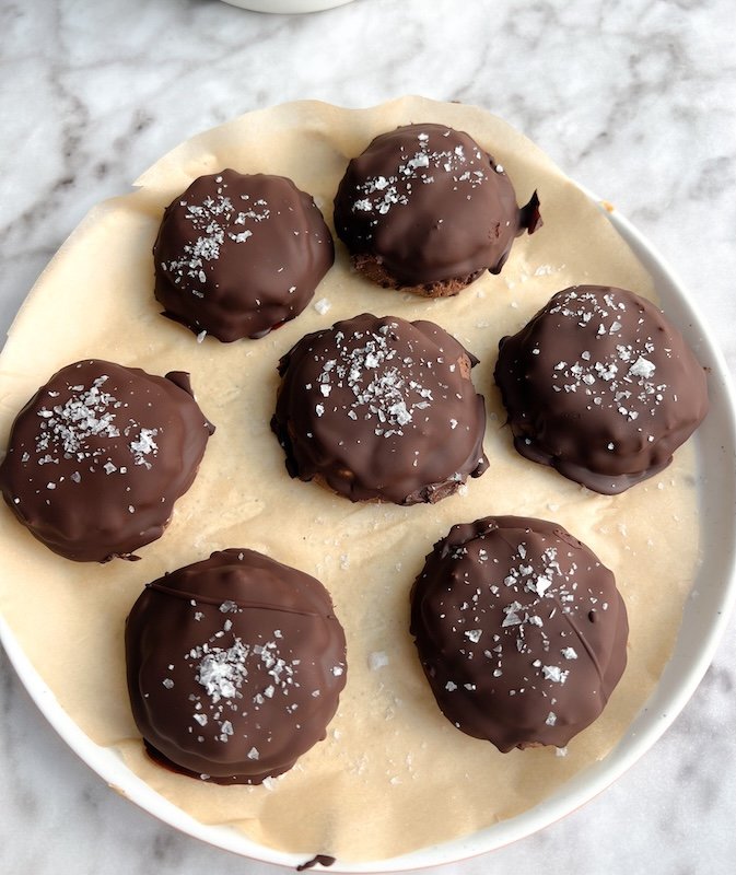 - coat in chocolate: melt the dairy-free chocolate chips with the coconut oil until smooth. dip each cookie fully in the melted chocolate or drizzle on top. place back in the freezer for 10 minutes to harden.