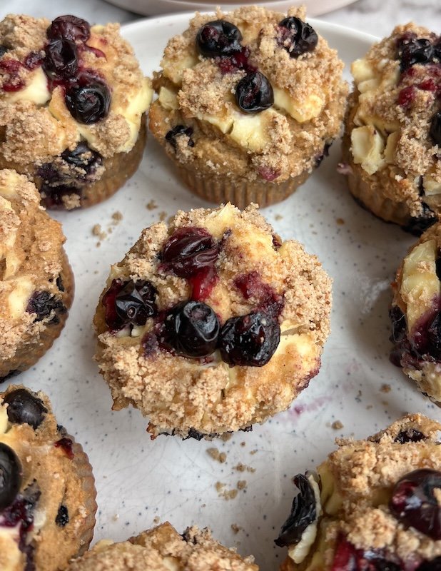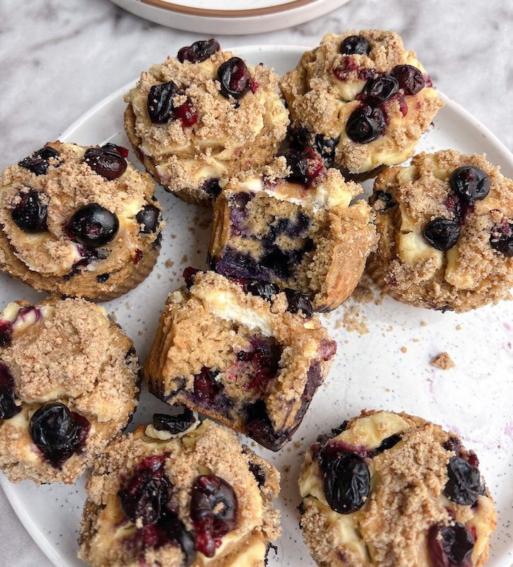 they’re soft, fluffy, and bursting with juicy blueberries, plus they have a creamy, cheesecake-like center and a buttery cinnamon streusel topping.
