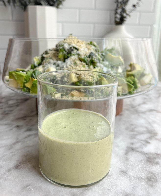 - in a blender, add the fresh basil, runny tahini, garlic powder, onion powder, italian seasoning, apple cider vinegar, maple syrup or agave, sea salt, and filtered water. blend until smooth.