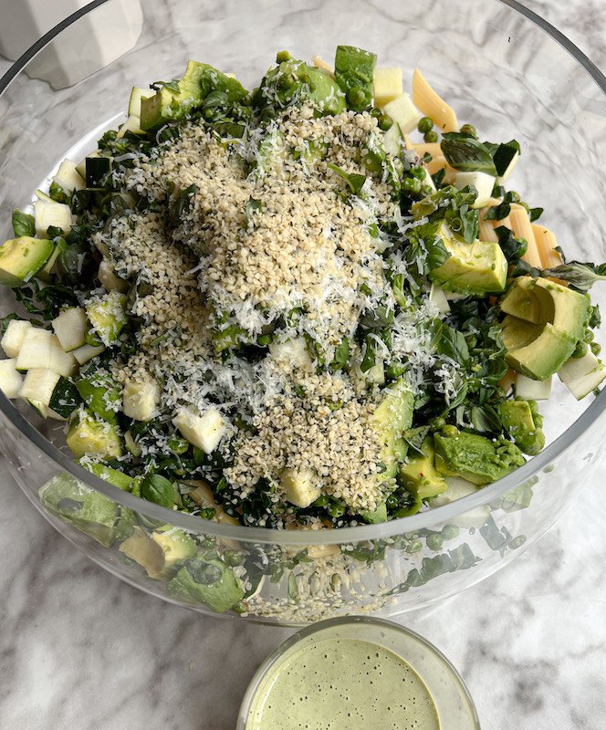 - in a large bowl, combine the cooked protein pasta, roasted peas, diced zucchini, massaged kale, diced avocados, chopped basil, hemp hearts, and grated parmesan cheese.