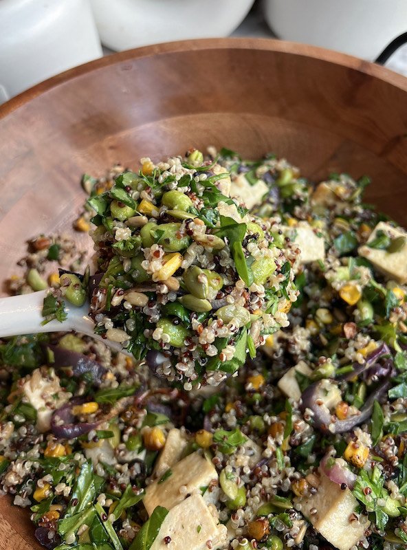 -in a large bowl, combine quinoa, roasted edamame, roasted corn, roasted red onion, roasted tofu, spinach, sunflower seeds, and pumpkin seeds.