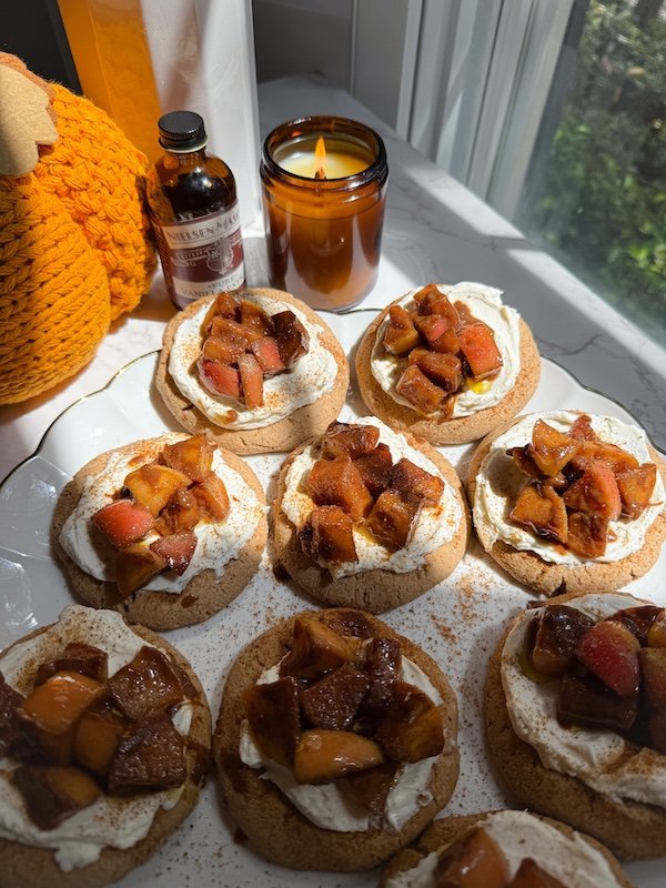 in a skillet over medium heat, melt the butter. add apples, coconut sugar, cinnamon, and pumpkin pie spice. sauté for 6–8 minutes until soft and lightly caramelized. remove from heat and stir in the coconut cream and nielsen-massey vanilla extract until glossy and saucy. let cool slightly before assembling. - assemble the cookies