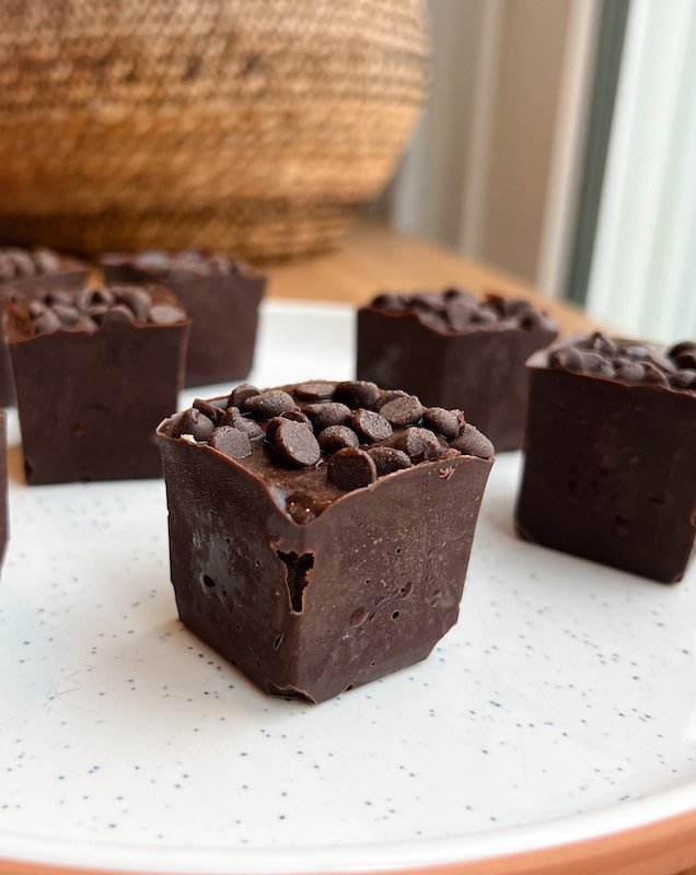 pour the fudge mixture into silicone ice cube molds and freeze for a couple of hours. then, remove and let them thaw a bit at room temperature.
