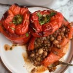 stuff the peppers: -spoon the lentil and chickpea mixture into each bell pepper, filling them to the top. -place the reserved tops back on the bell peppers.