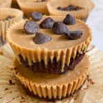 the brownie dough is sticky, so with slightly wet hands, add a large spoonful of the brownie mixture to parchment paper muffin cups and flatten.