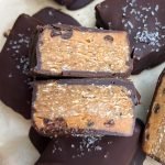 base layer: 1 cup oatsome overnight oats 1 cup freeze-dried banana 1/2 cup runny peanut butter 3 tbsp maple syrup 1/4 cup dairy-free milk (add more if needed) filling: 1/3 cup runny peanut butter 1 tbsp coconut oil 2 tbsp maple syrup 1/4 cup mini chocolate chips topping: 1/2 cup melted unsweetened chocolate (e.g., pascha)