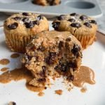 1 cup chickpea or garbanzo bean flour 1 cup almond flour 1/2 tbsp baking powder 1.5 tbsp arrowroot flour 1/3 cup runny almond butter 1/3 cup maple syrup 1/2 cup unsweetened almond milk 1/3 cup melted avocado oil 2 large ripe bananas, mashed (about 1 cup) 1/2 cup vegan chocolate chips