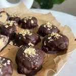 melt the chocolate chips and then coat each of the cookie dough bites in chocolate. sprinkle the top with a little sea salt or crushed pretzels.