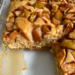 add the apples to the top of the cake batter and bake at 350 degrees for 55 minutes.