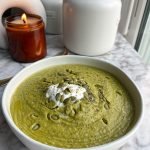 blend: transfer the sautéed mixture to a blender with the roasted broccoli, chickpeas, 3 cups vegetable broth, pumpkin seed protein powder, paprika, coconut milk, tahini, and lemon juice. blend until smooth. add more broth if needed for desired consistency.