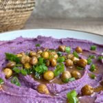 2 roasted purple sweet potatoes (can use any sweet potato variety!) 1 can chickpeas, rinsed and drained avocado oil 1/3 cup vegan labneh (e.g., Cocojune) or thick coconut yogurt 1/4 cup runny tahini 2 garlic cloves 1 tsp onion powder 1/2 cup vegetable broth (may need to add more) sea salt and pepper to taste