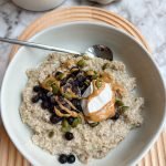 divide the quinoa into two bowls and top with frozen blueberries, pumpkin seeds, nut butter, and extra coconut yogurt. serve warm and enjoy!