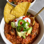 cook about 28 minutes until the chili has thickened and then enjoy with your favorite toppings!