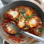 add garlic, harissa paste, and paprika. cook 30 seconds, stirring constantly, until fragrant. add cherry tomatoes and increase heat to medium-high. cover and cook 4 minutes, until tomatoes soften and burst.