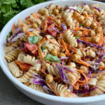 add the chickpeas, cilantro, veggies and cooked + cool down pasta to a large mixing bowl.