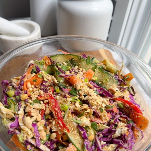 In a small bowl, whisk together the peanut butter, rice vinegar or lime juice, coconut aminos, honey, ginger, and garlic.
