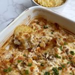 2 medium yellow onions, finely diced 1 tsp olive oil or avocado oil 1 tsp sea salt (divided) 1/2 tsp black pepper 1 tsp garlic powder 1 tsp onion powder 1 cup 2% plain greek yogurt 1/2 cup light sour cream 1/2 cup shredded gruyere cheese 1/4 cup shredded sharp cheddar cheese (plus 1/3 cup for topping) 1 tsp worcestershire sauce (or coconut aminos for gluten-free) 1/4 tsp paprika