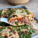 place the remaining 4 tortillas on top of the sauce. sprinkle vegan cheese evenly over the top layer of tortillas or drizzle if using miyoko's liquid vegan mozzarella.
