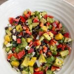 once well combined, serve immediately and enjoy your feel good veggie, bean and mango salsa salad!
