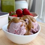 ingredients: 1 cup full-fat canned coconut milk 1 1/2 scoops vanilla protein powder (used truvani – about 45g) 1/8 cup honey 2 cups frozen strawberries 3/4 cup fresh chopped strawberries (for topping) optional: splash of water to help blend