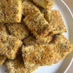 cut the tofu into squares that are about 1/2 inch thick. add the bread, herbs, garlic and sea salt to a food processor and blend until a fine and grainy consistency.