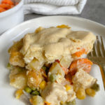 roll out the dough 1/4-1/3 inch thick and place on top of the pot pie covering as much as possible. bake at 375 for 30 minutes and then enjoy!!