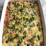 assemble u0026 bake: reduce oven temperature to 375°f. transfer crispy smashed potatoes into a greased 9x13 baking dish. add the sautéed veggies into the egg mixture along with the basil and pour the egg mixture over everything. bake for 32-33 minutes or until eggs are set in the center. top with 3/4 cup shredded cheese and broil for 1 minute max.