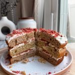 preheat oven to 350ºf. line and grease three 8-inch cake pans. in a large bowl, whisk together almond flour, oat flour, baking powder, baking soda, and salt.