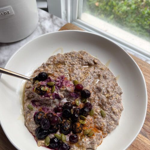 This version is different because we fortify it with chia seeds, flax meal, and protein powder. The chia and flax add soluble fiber and healthy fats that slow digestion and support satiety. They also provide omega-3s and lignans, which can be supportive for hormone health. The protein powder ensures this bowl has staying power and supports muscle maintenance, metabolism, and blood sugar balance.