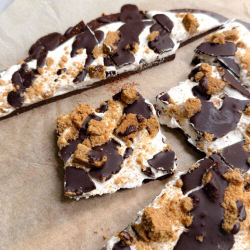 Slice or break into pieces and enjoy. Store in the freezer and let the bark sit at room temperature for a few minutes before enjoying for the best texture. The marshmallow layer will firm up in the freezer, but softens into that perfect creamy, gooey s’mores consistency after 5-10 minutes, making it much easier (and more enjoyable) to bite into.