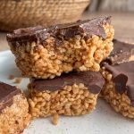 4 cups crispy rice cereal (check to make sure vegan) 1/3 cup maple syrup 1 cup runny peanut butter 2 tsp vanilla extract chocolate topping 1 and 1/4 cup chocolate chips 1-2 tbsp coconut oil