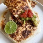 add a generous amount of the vegan meat to the center of a large burrito. then, layer on the guac, pico de gallo, and vegan cheese.