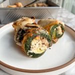 once the zucchini slices are done, take them out of the oven. spoon the ricotta mixture onto each slice, then roll them up. i like to load them generously.