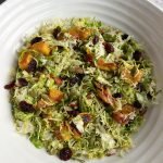 assemble the salad: in a large salad bowl, combine the shaved brussels sprouts, savoy cabbage, toasted almonds, dried cranberries, and half of the vegan grated parmesan. toss gently.