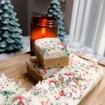 place the pan in the freezer for 1 hour to firm up. remove and spread the frosting evenly on top. add festive christmas sprinkles.