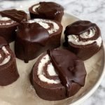 gently roll the dough into a tight log using the parchment paper to help guide it. freeze the log for 1 hour to firm up. once set, slice into 7 rolls. add melted chocolate to the top if wanted. store in the fridge or freezer and enjoy chilled.