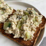 break apart the tofu and add all ingredients but the raisins and celery/cucumber to a food processor and blend until a thick, grainy texture forms. see pictures for reference.