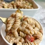 1 box cooked protein pasta of choice 1 cup diced tomatoes 1 1/2 cups diced zucchini 1 can chickpeas, rinsed and drained 1/8 cup avocado oil 1/2 tsp sea salt 1/2 tsp garlic powder 1 tsp onion powder 1 tsp dried dill (optional) 1 cup hummus of choice