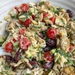 for falafel: 1 can chickpeas, rinsed and drained 1/2 cup chickpea flour 1 tablespoon arrowroot 1 teaspoon ground cumin 1 teaspoon garlic powder 1 teaspoon onion powder juice of 1/2 small lemon 1/4 cup + 1 tablespoon olive oil 1/2 teaspoon sea salt handful of chopped parsley for salad: 1 1/2 cups cooked orzo 1 cup kalamata olives 1 1/2 cups cherry tomatoes, halved 1 large cucumber, diced 1 cup crumbled vegan feta 1/4 cup chopped parsley for dressing: 1 teaspoon lakanto allulose sweetener (or preferred sweetener) 1/3 cup hummus 1/3 cup olive oil juice of 1/2 lemon 1 tablespoon minced garlic 1/2 teaspoon onion powder 1/2 tablespoon red wine vinegar sea salt to taste