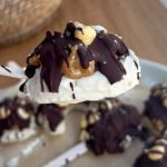 once the yogurt pops are frozen, spread the peanut butter mixture on top of each pop.